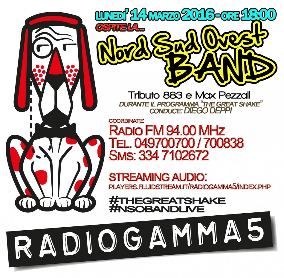 Vi segnaliamo l’appuntamento per il 14/03/2016 alle ore 18 in diretta su Radio Gamma 5 con la Nord Sud Ovest Band, durante il programma The Great Shake – Gamma 5, condotto da Diego Deppi. Coordinate per ascoltarci e contattarci: Radio FM 94.00 MHz Tel. ...